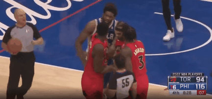 第四节比赛中,味浓恩比德对西亚卡姆犯规后,恩比二者又爆发冲突。德对